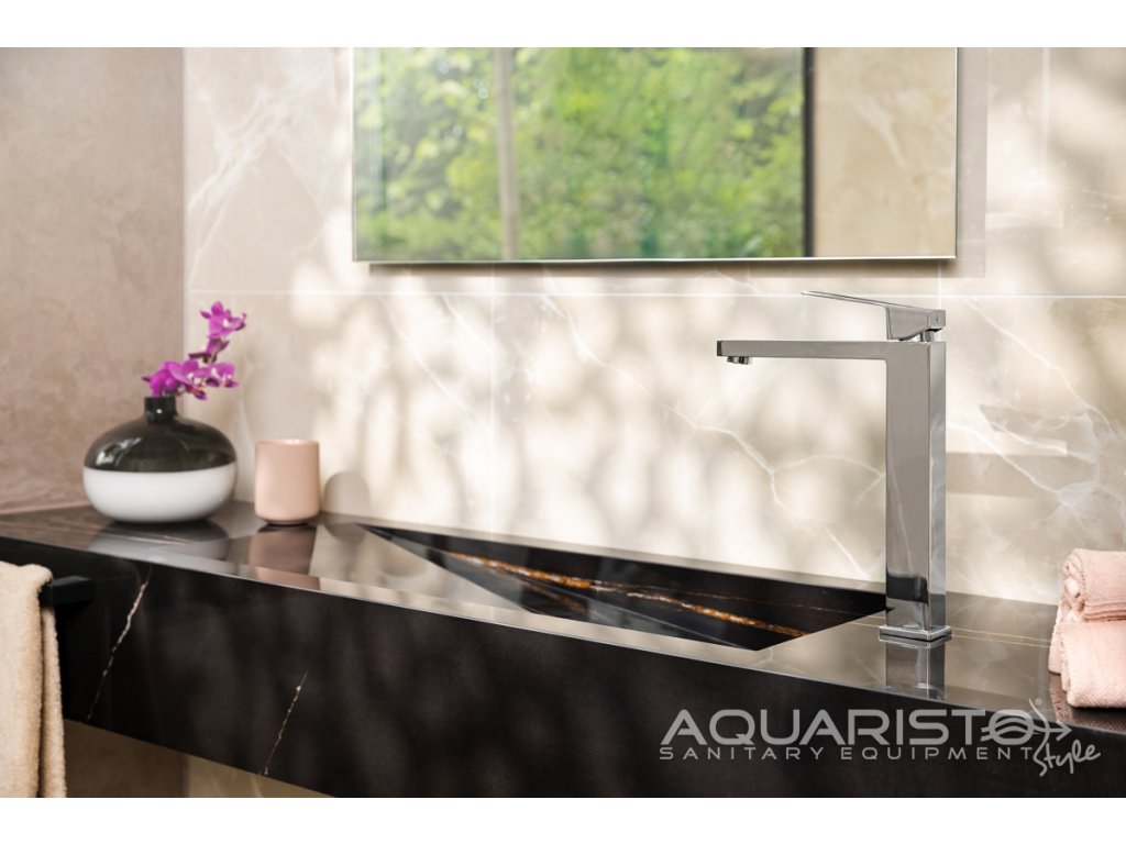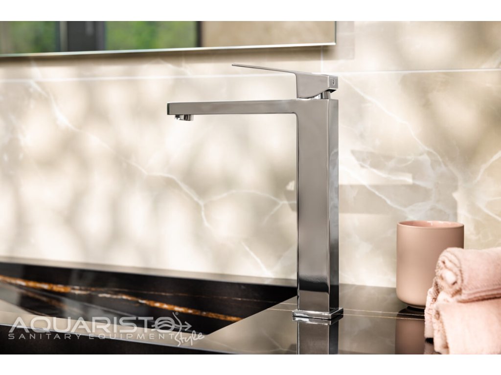 Vysoká páková stojanková vodovodná batéria zo série Cinque značky Aquaristo Style, určená k umývadlám.