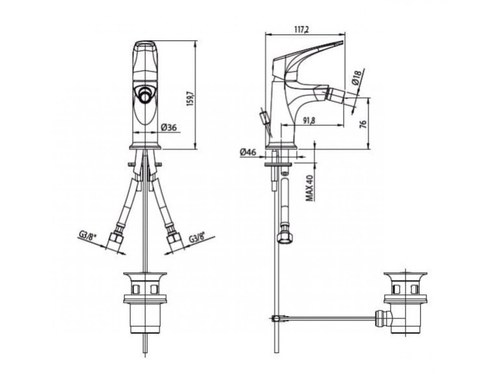 Páková bidetová stojanková vodovodná batéria s odtokovou garnitúrou.