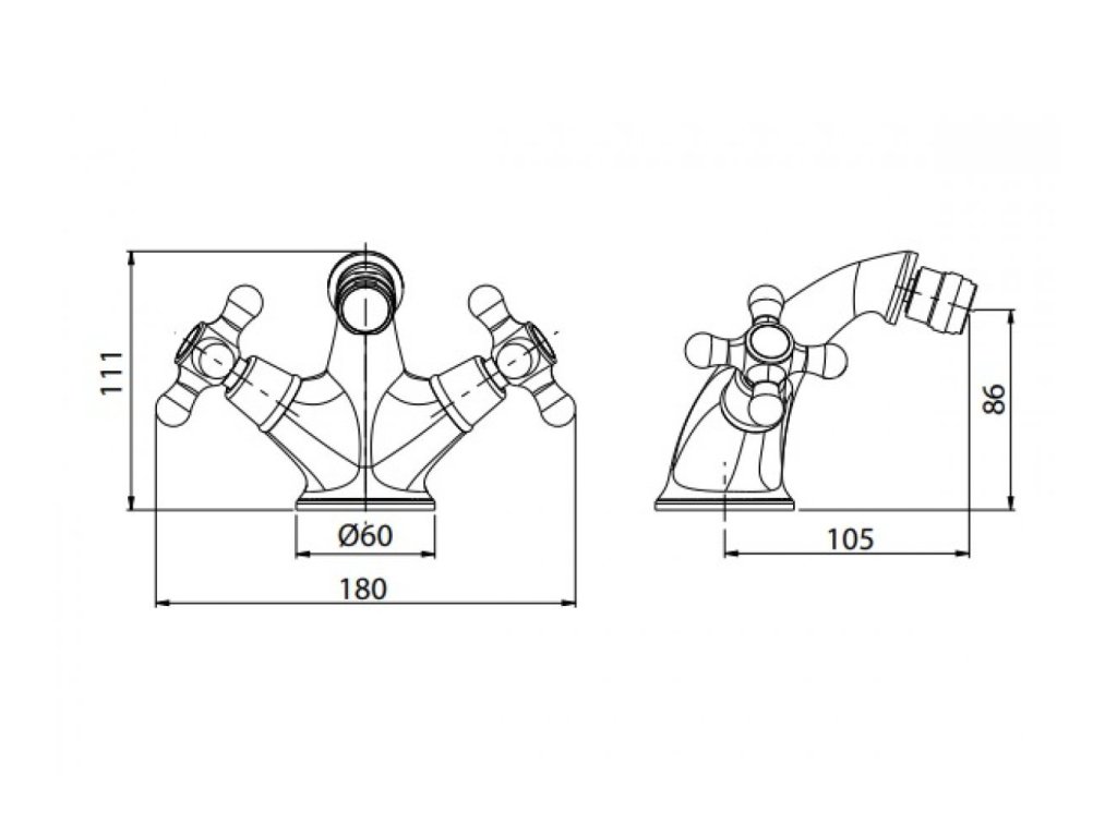 Klasická bidetová stojanková vodovodná batéria s odtokovou garnitúrou. Batéria je osadená keramickými vrškami so štandardne pólovaným ovládaním. Znamená to, že studená voda sa otvára resp. zatvára opačným smerom ako teplá.