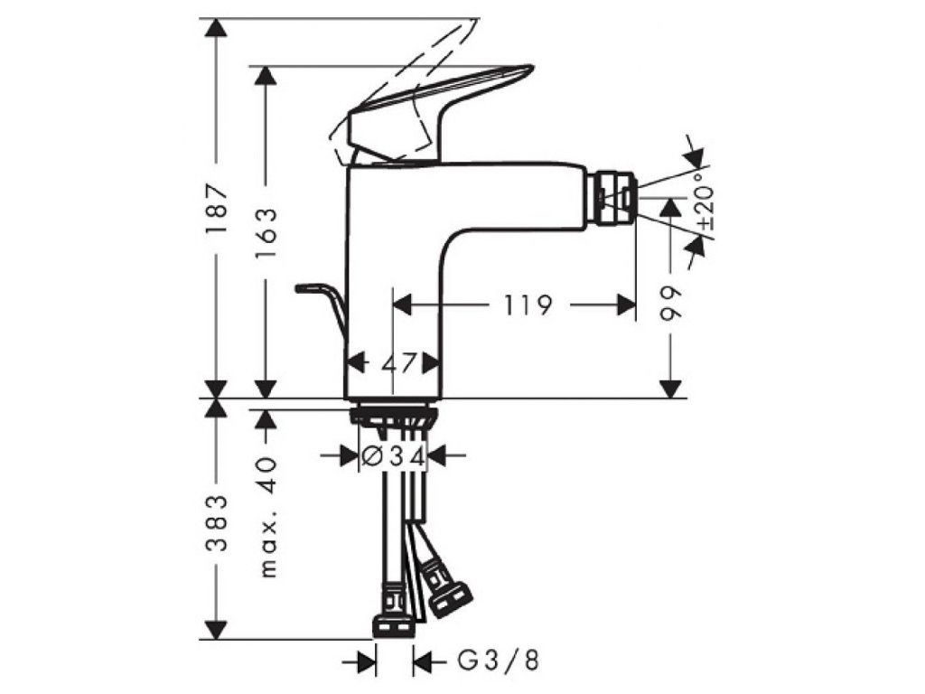 Páková bidetová stojanková vodovodná batéria s odtokovou garnitúrou s tiahlom. Súčasťou je perlátor s guľovým kĺbom.