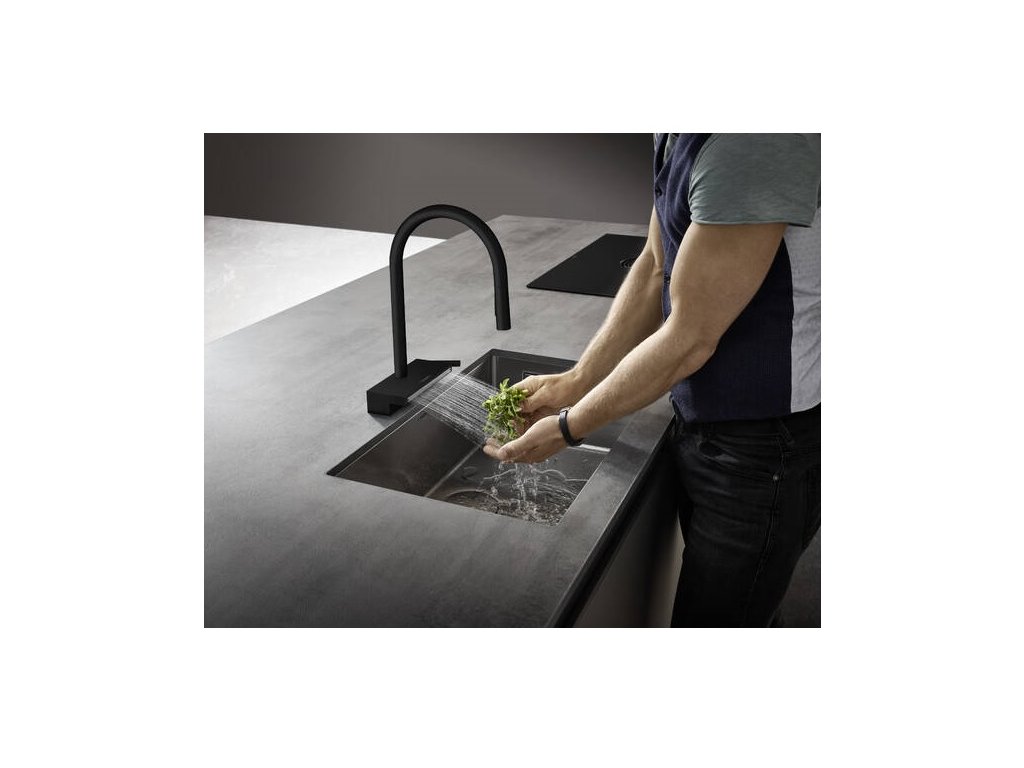 Ste milovníkom dizajnu a potrpíte si na inovatívne technológie aj v kuchyni? Potom si nepochybne zamilujete štýlovú drezovú batériu AQUNO SELECT M81 od Hansgrohe, ktorá do vašej kuchyne prinesie nový rozmer komfortu a flexibility. Vďaka nej jednoducho zabudnete na obyčajnosť a to predovšetkým pre jej vysokú funkčnosť. Batéria sa pýši revolučným plochým sprchovým prúdom Satin Flow: je veľmi jemný a šetrný aj k oplachovaniu krehkého riadu či drobného ovocia. A to bez otravného rozstrekovania vody. Pri oplachovaní ovocia či zeleniny oceníte aj multifunkčné sitko, dodávané s batériou. Batéria Aquno Select M81 je opatrená aj výsuvnou koncovkou Pull-Out so sprškou, ktorú prepínate komfortne pomocou tlačidla Select. Súčasťou je i praktický magnetický držiak spršky MagFit. Sprchovú hadicu môžete vytiahnuť až do dĺžky 76cm, vďaka čomu si užijete maximálny rozsah pohybu a maximum komfortu pri umývaní riadu, drezu, ale i naplňovaní vysokých hrncov a váz. Hladké a tiché vedenie sprchovej hadice zabezpečuje sBox ukrytý pod drezom. Jeho plochý tvar šetrí v skrinke miesto.