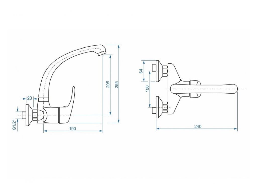 Páková drezová či umývadlová stenová vodovodná batéria s horným liatym "U" výtokovým ramenom.