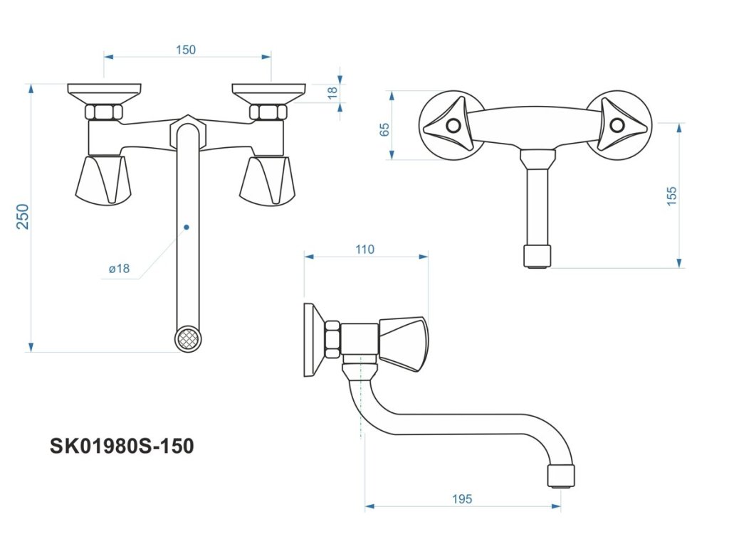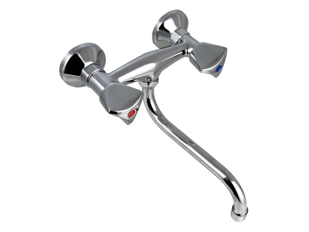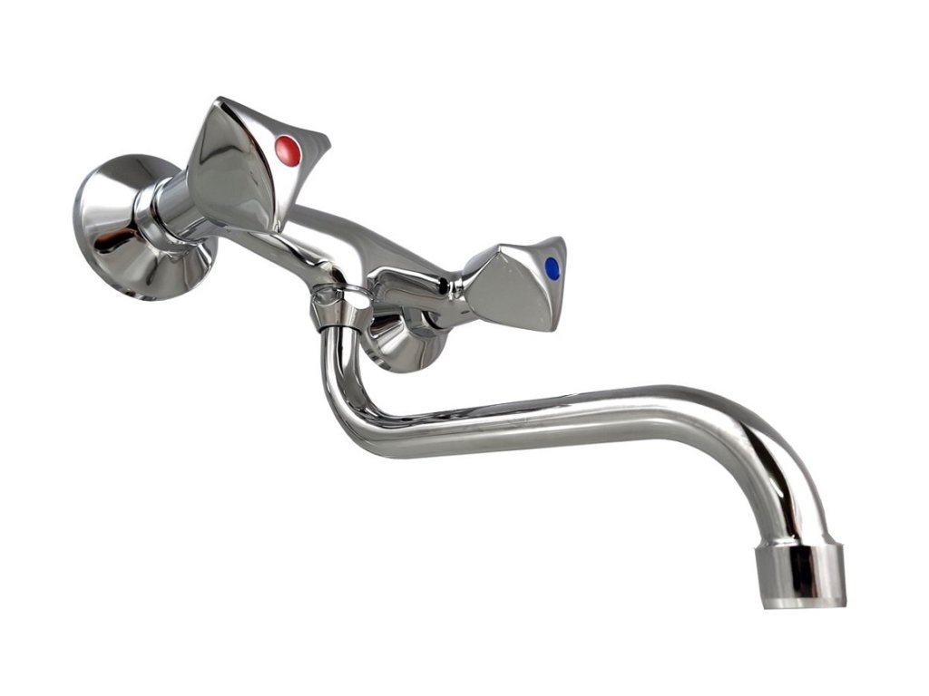 Klasická drezová stenová vodovodná batéria s trubkovým 18cm "S" výtokovým ramenom.Rozstup batérie je 150mm.