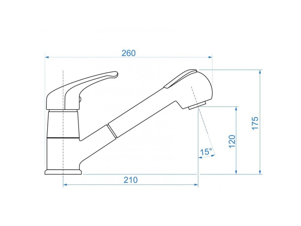 Páková drezová stojanková vodovodná batéria. Výtokové rameno batérie je otočné a je ukončené výsuvnou sprchou s možnosťou prepnutia medzi dvomi režimami prúdu: perlátor/sprška.