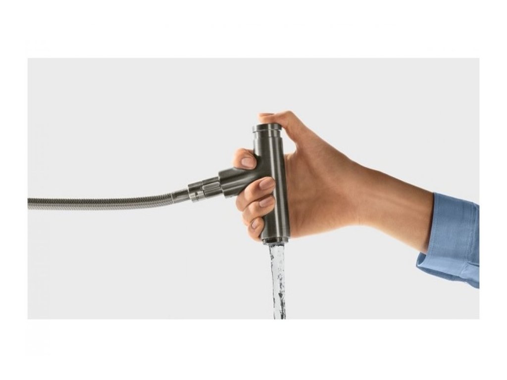 Páková drezová stojanková vodovodná batéria s vyťahovacou sprškou s laminárnym prúdom. Súčasťou je magnetický držiak spršky MagFit.
