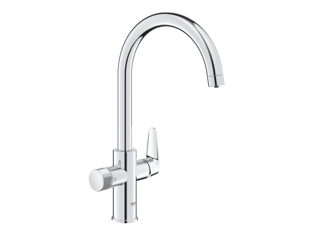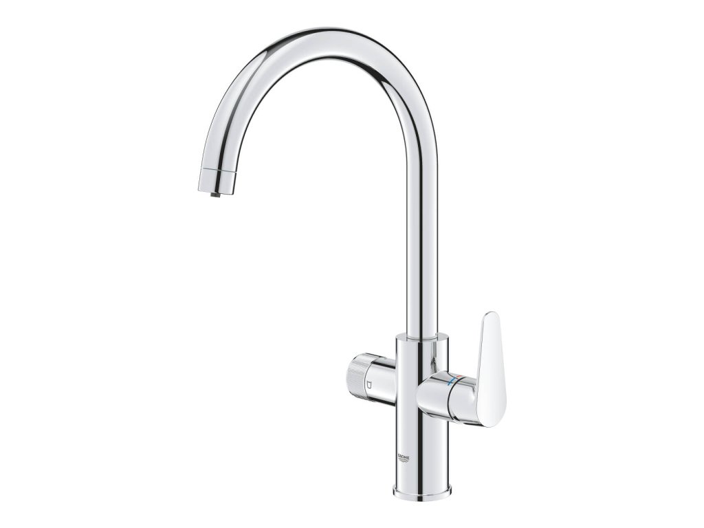Batéria drezová stojanková StartCurve BLUE PURE značky GROHE. S filtračnou funkciou. So samostatnou pákou pre filtrovanú vodu a s oddeleným vedením vody pre filtrovanú a nefiltrovanú vodu.