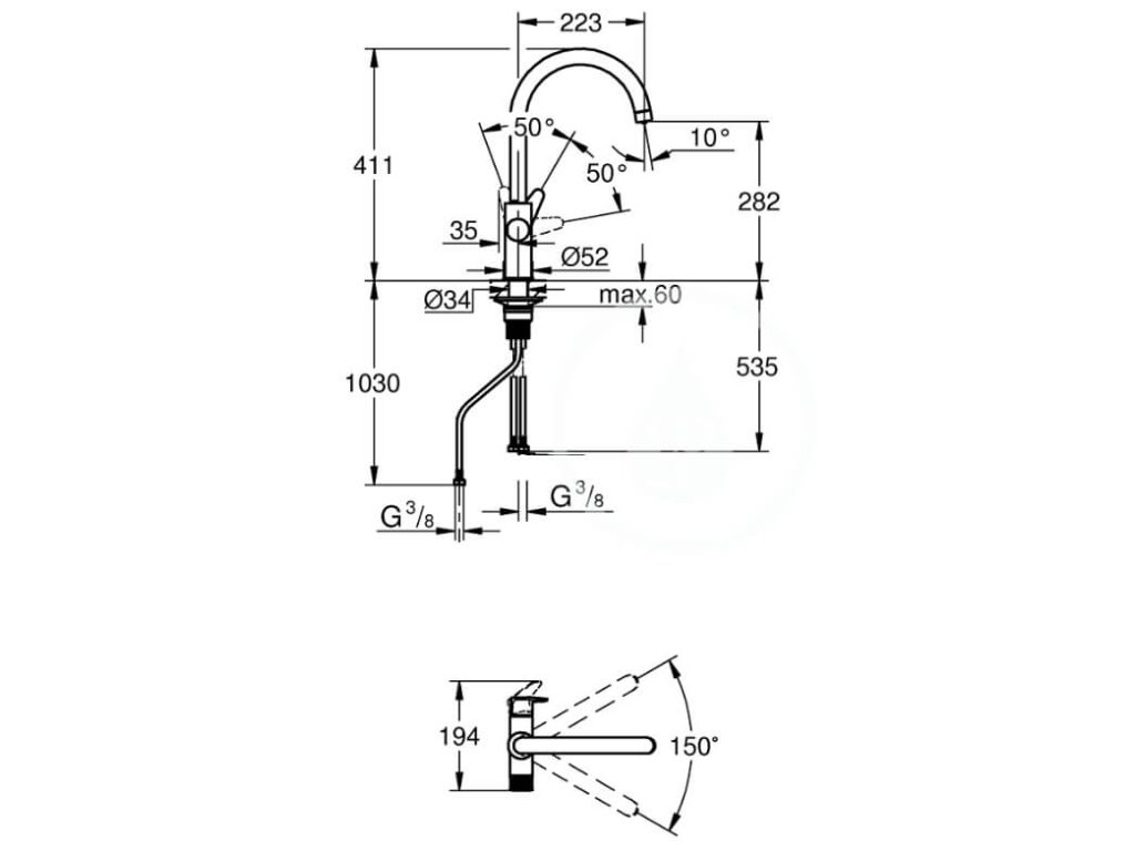 Výtoková trubica tvaru "C" s otočným uhlom 150°.