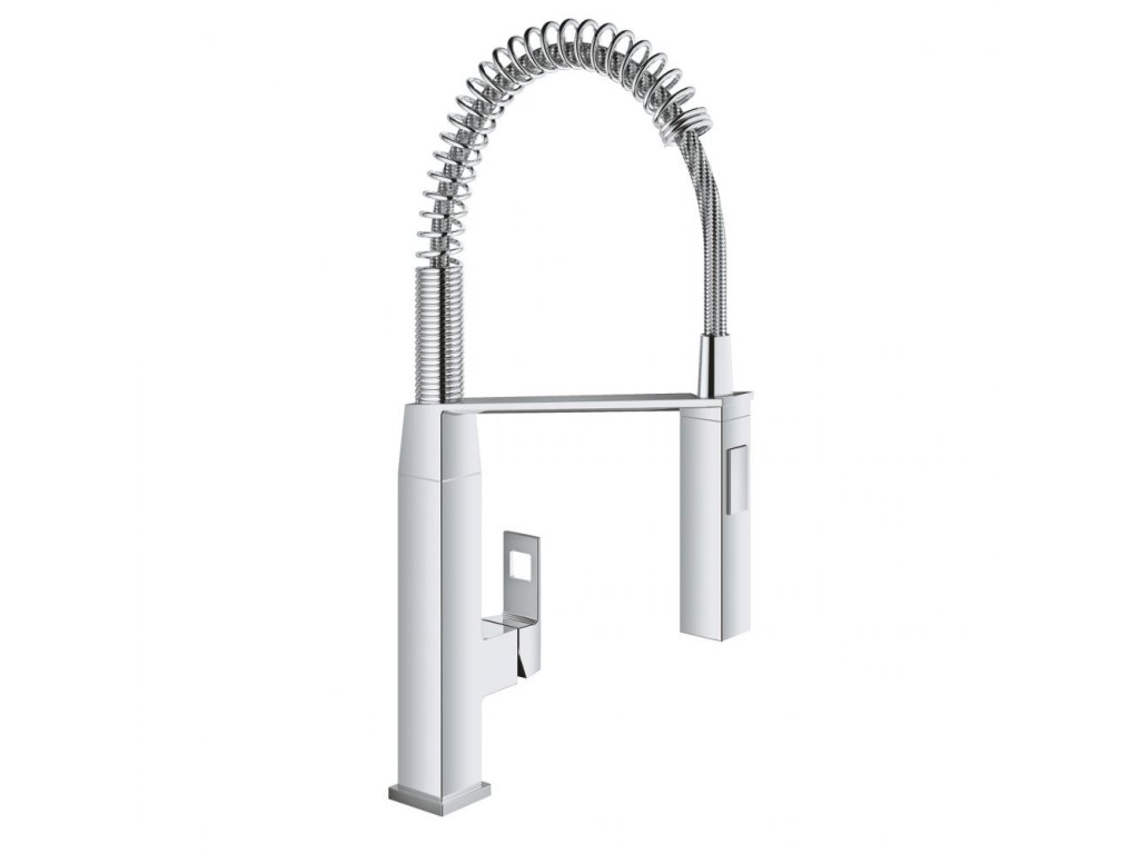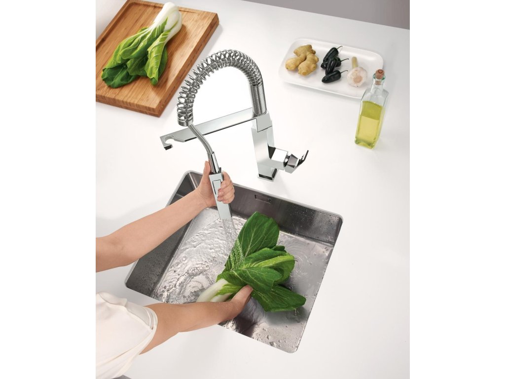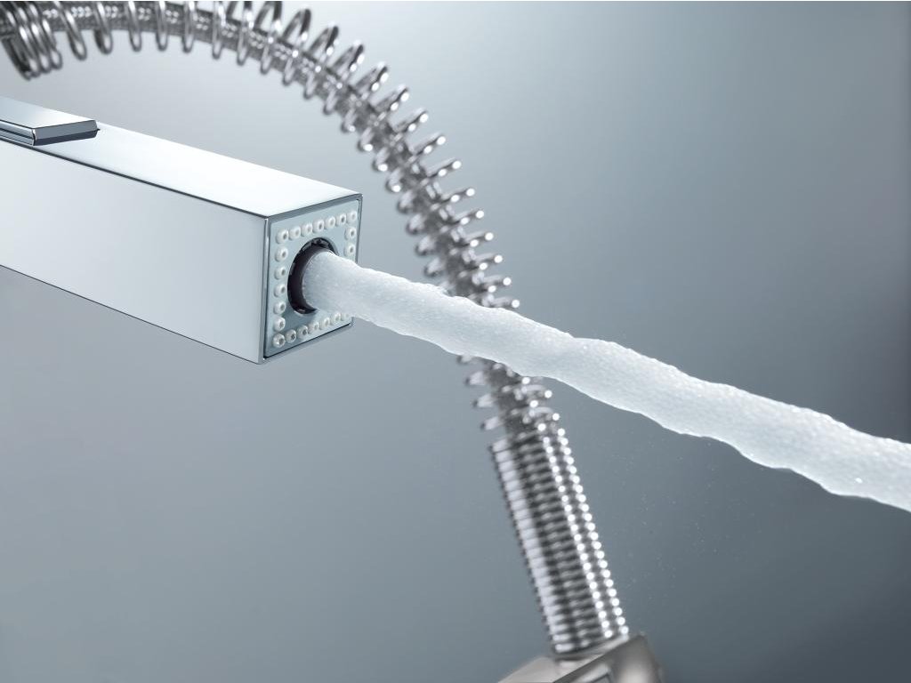 Profesionálna páková drezová stojanková vodovodná batéria s vyťahovavou sprchou s možnosťou prepínania medzi perlátorom a SpeedClean sprchovým prúdom. S automatickým spätným prepínaním na perlátor.