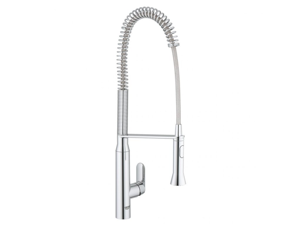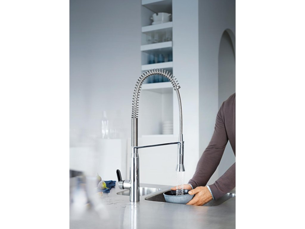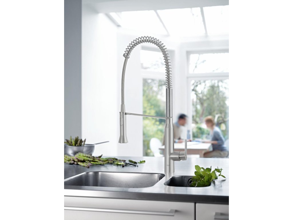 Páková drezová stojanková vodovodná batéria s profesionálnou kovovou sprškou s možnosťou prepínania medzi perlátorom a SpeedClean sprchovým prúdom. S automatickým spätným prepínaním na perlátor.