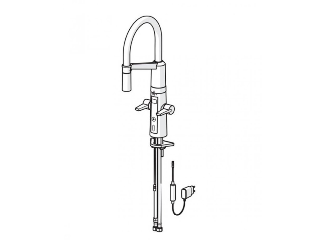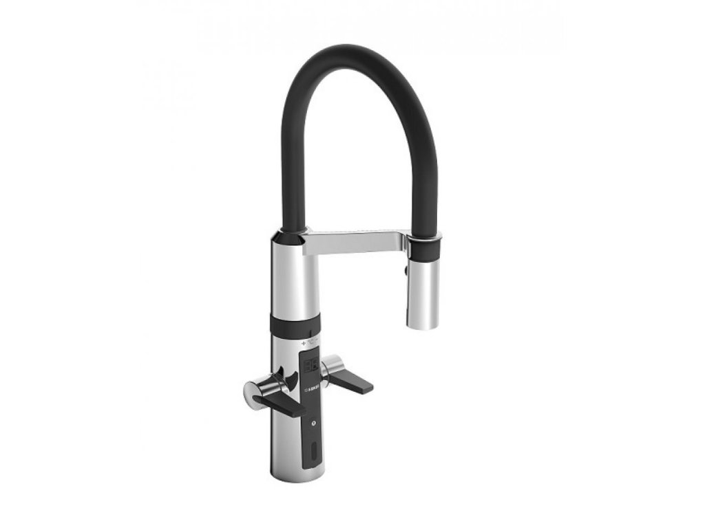 HANSAFIT - senzorová stojanková vodovodná batéria, vhodná na použitie k drezom. Má otočné výtokové rameno, vyťahovaciu ručnú sprchu s klasickým a intenzívnym prúdom