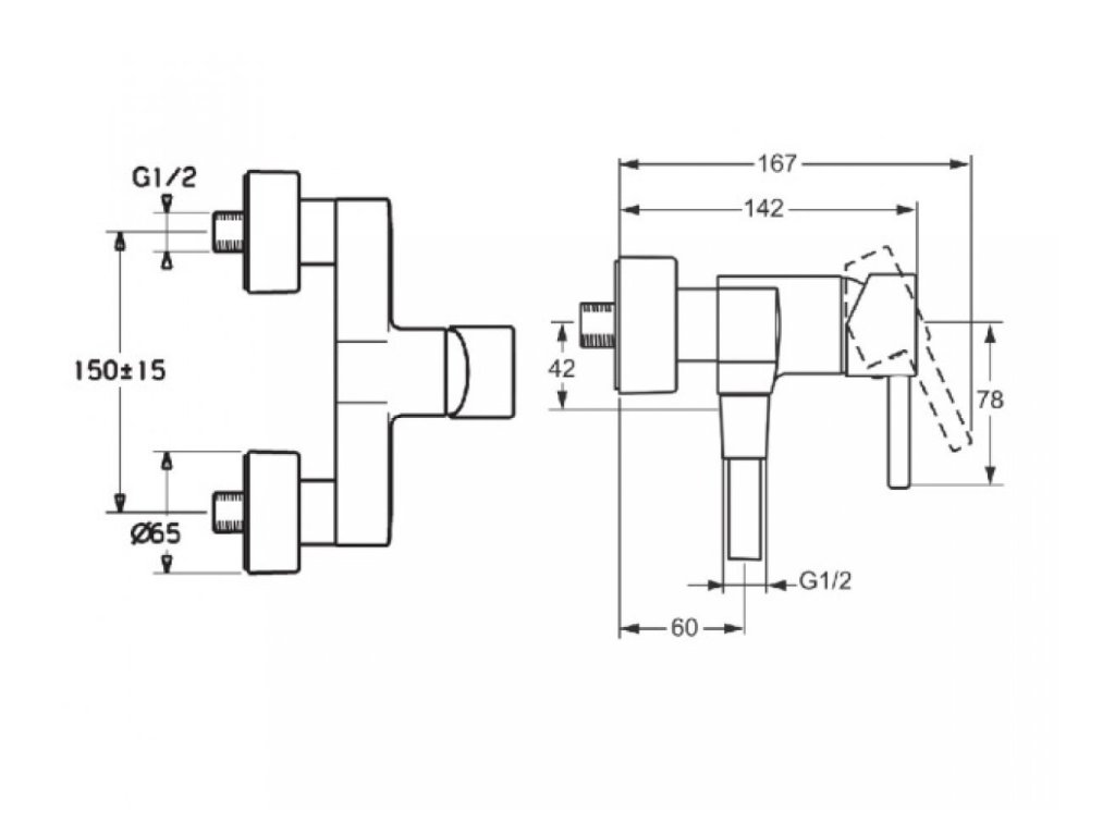 HANSAVANTIS - sprchová stenová vodovodná batéria s pevným výtokovým ramenom, ovládaná s PIN-tyčinkovou pákou so symbolom teplej a studenej vody.
