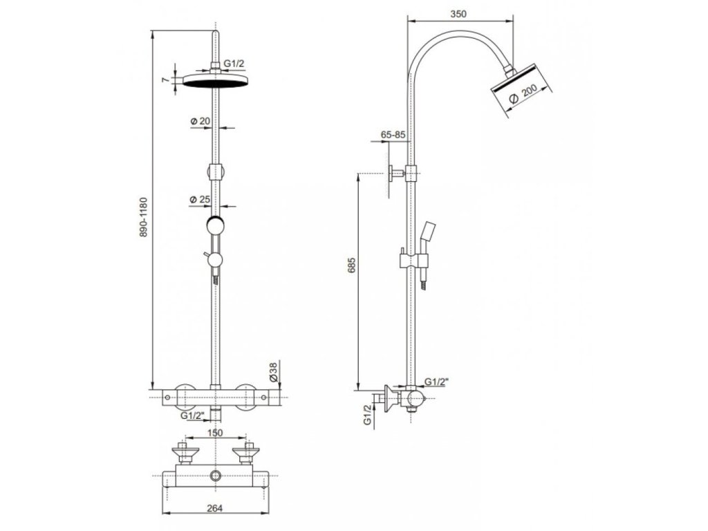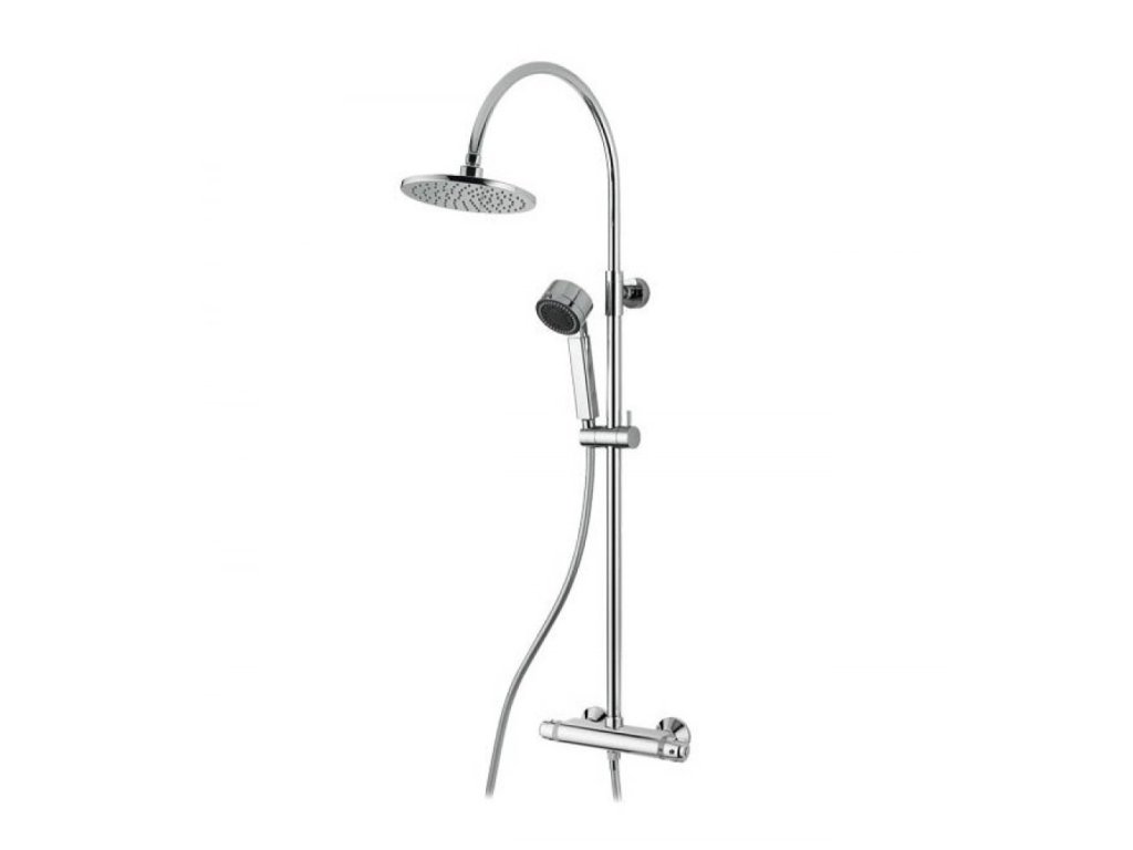Páková sprchová stenová termostatická vodovodná batéria s komplet príslušenstvom. Obsahom balenia je nasledovné príslušenstvo: Teleskopická sprchová tyč s hlavovou sprchou, sprchová hadica a ručná sprcha. Dĺžka kovového teleskopického ramena je v rozpätí 890 - 1200 mm. Priemer hlavovej sprchy je 200mm. Hlavová sprcha je kovová, vyrobená z mosadze. Na sprchovú tyč sa pripája pomocou otočného naklápateľného kĺbu, na ktorom je vnútorný 1/2" závit. Trysky hlavovej sprchy sú plastové - silikónové, nezanášajú sa vodným kameňom. Dĺžka plastovej sprchovej hadice je 150cm. Ručná sprcha je 4-polohová.