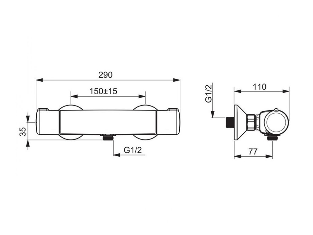 HANSAMICRA - sprchová termostatická vodovodná batéria s nástennou montážou, ovládaná pomocou rukoväte pre reguláciou prietoku vody a rukoväte pre reguláciu pre teplotu vody.