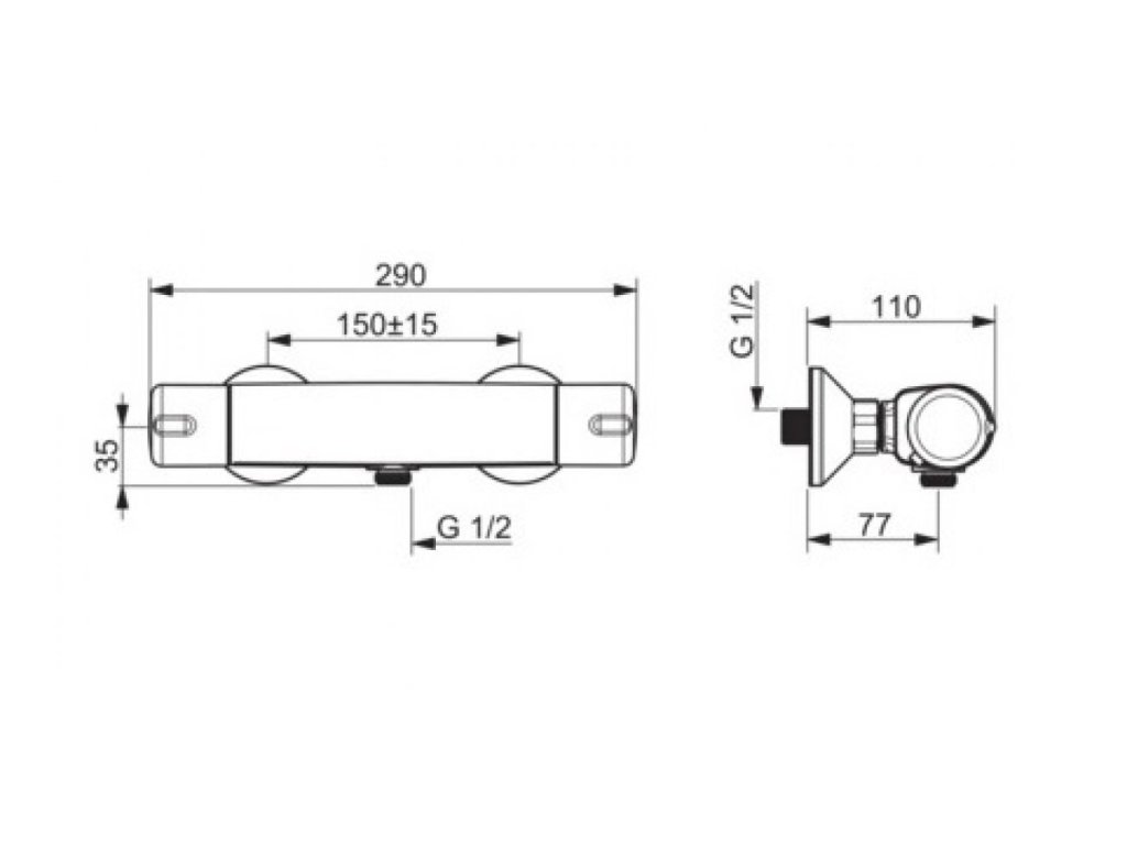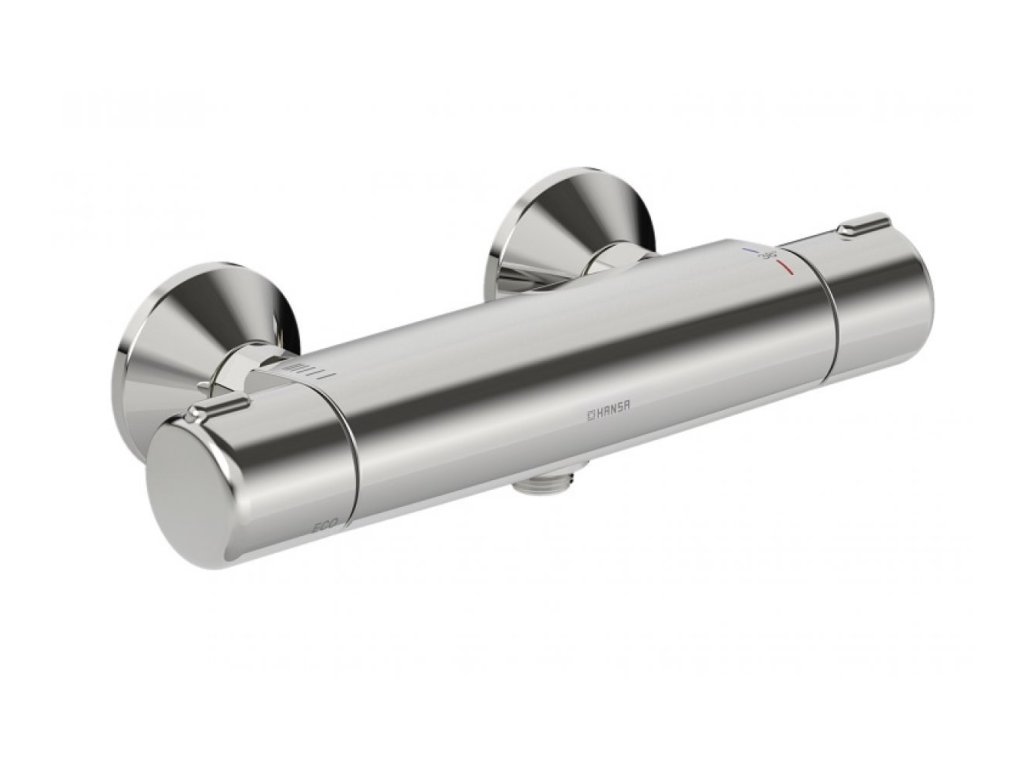 HANSAMICRA - sprchová termostatická vodovodná batéria s nástennou montážou, ovládaná pomocou rukoväte pre reguláciou prietoku vody a rukoväte pre reguláciu pre teplotu vody.