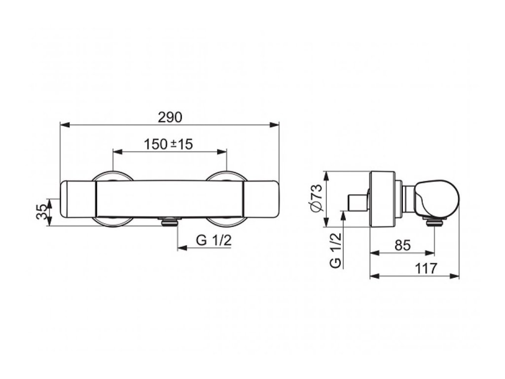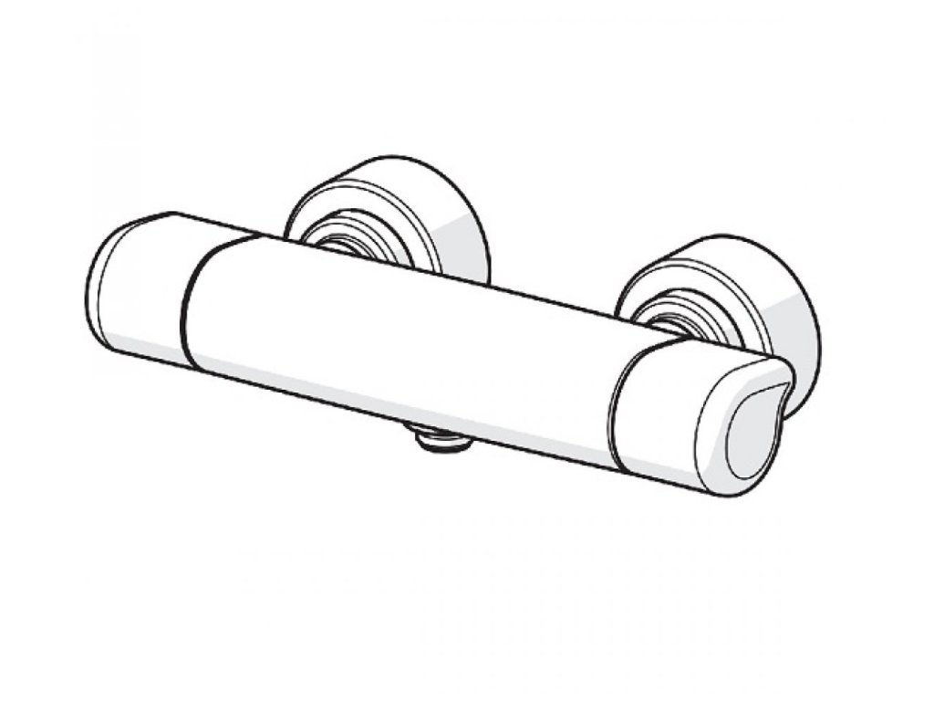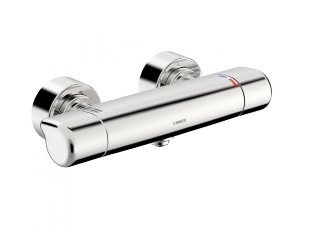 HANSACARE - sprchová termostatická vodovodná batéria so stenovou montážou, ovládaná pomocou rukoväte pre reguláciou prietoku vody a rukoväte pre reguláciu teplotu vody.