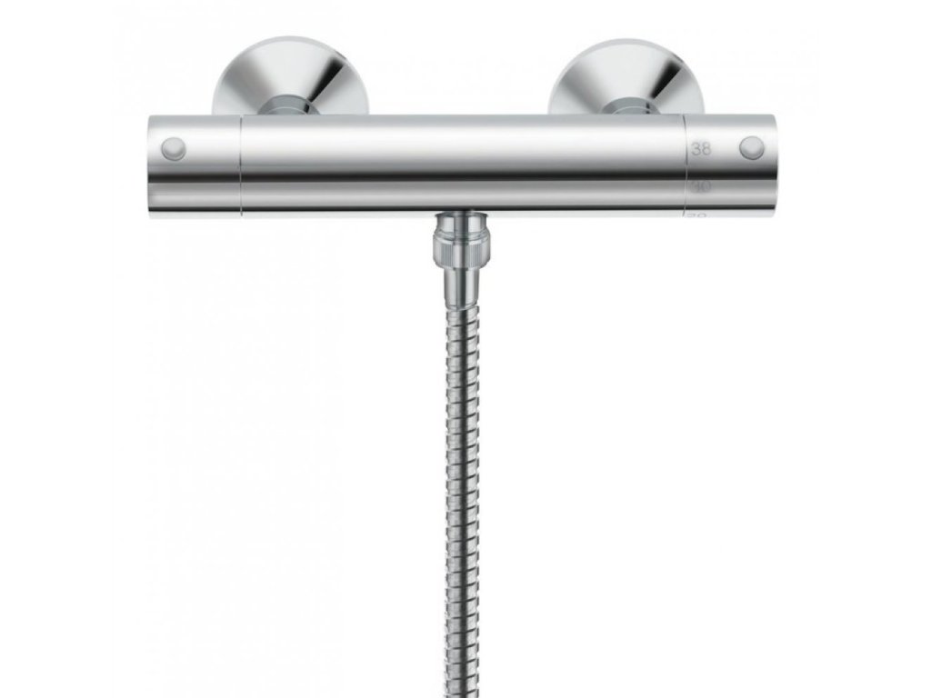 Sprchová stenová termostatická vodovodná batéria bez príslušenstva. Súčasťou balenia sú etážky aj krycie ružice.