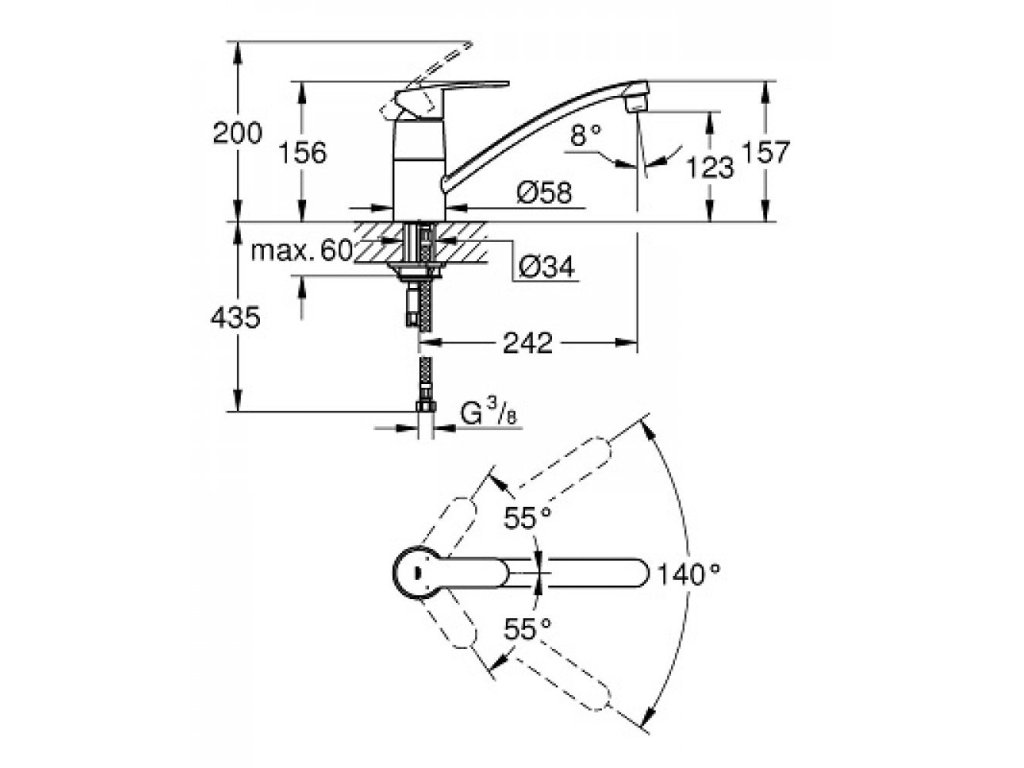 Páková drezová stojanková vodovodná batéria s perlátorom. Ploché výtokové ramienko je otočné, s rozsahom otáčania 140°.