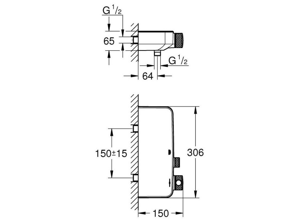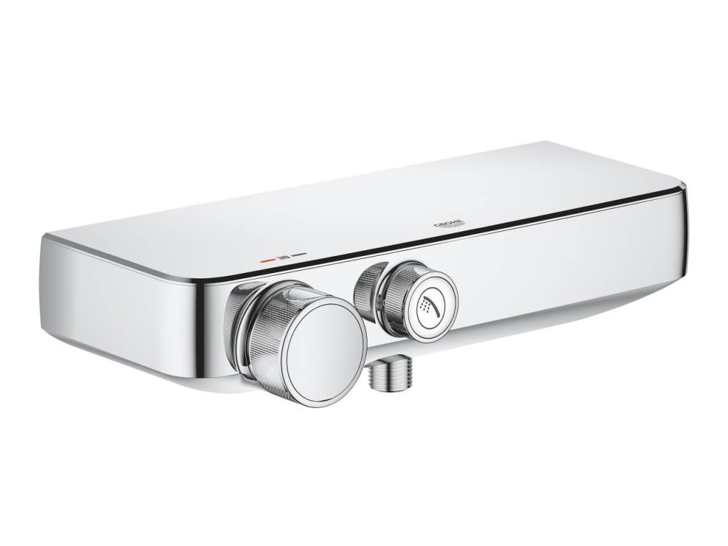 Termostatická sprchová stenová vodovodná batéria GROHTHERM SmartControl, dodávaná bez sprchového príslušenstva. Integrovaná praktická priehradka GROHE EasyReach pre odkladanie kozmetiky.