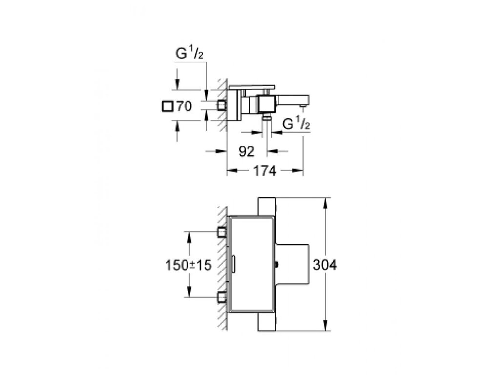 Hranatá termostatická sprchová vodovodná batéria, dodávaná bez sprchového príslušenstva. Určená pre nástennú montáž.