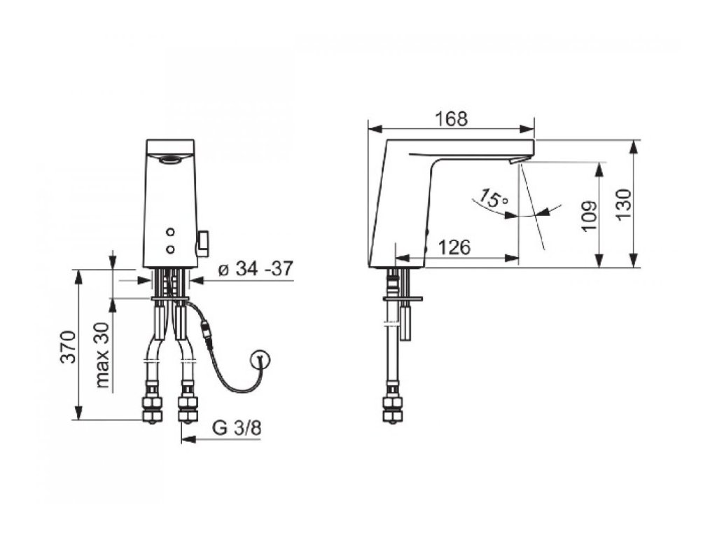 HANSASTELA - umývadlová senzorová vodovodná batéria s ovládacou rukoväťou pre reguláciu teploty vody. Batéria má pevné liate výtokové ramienko s CASCADE® - aerátorom. S tlačným uzáverom odpadu.
