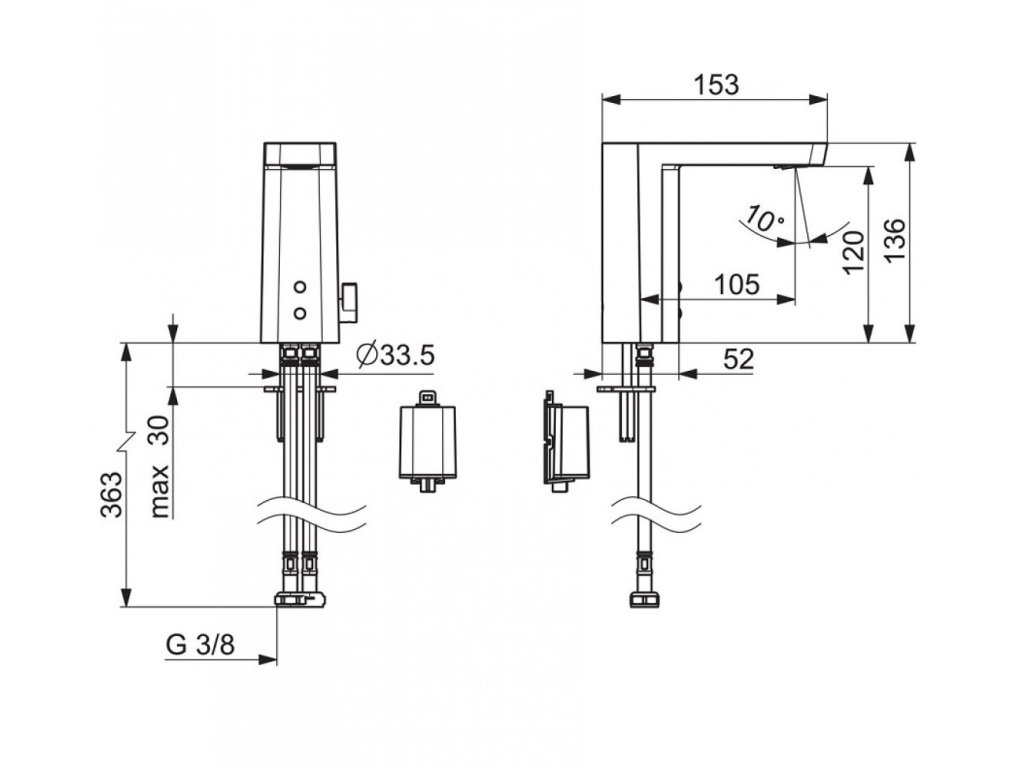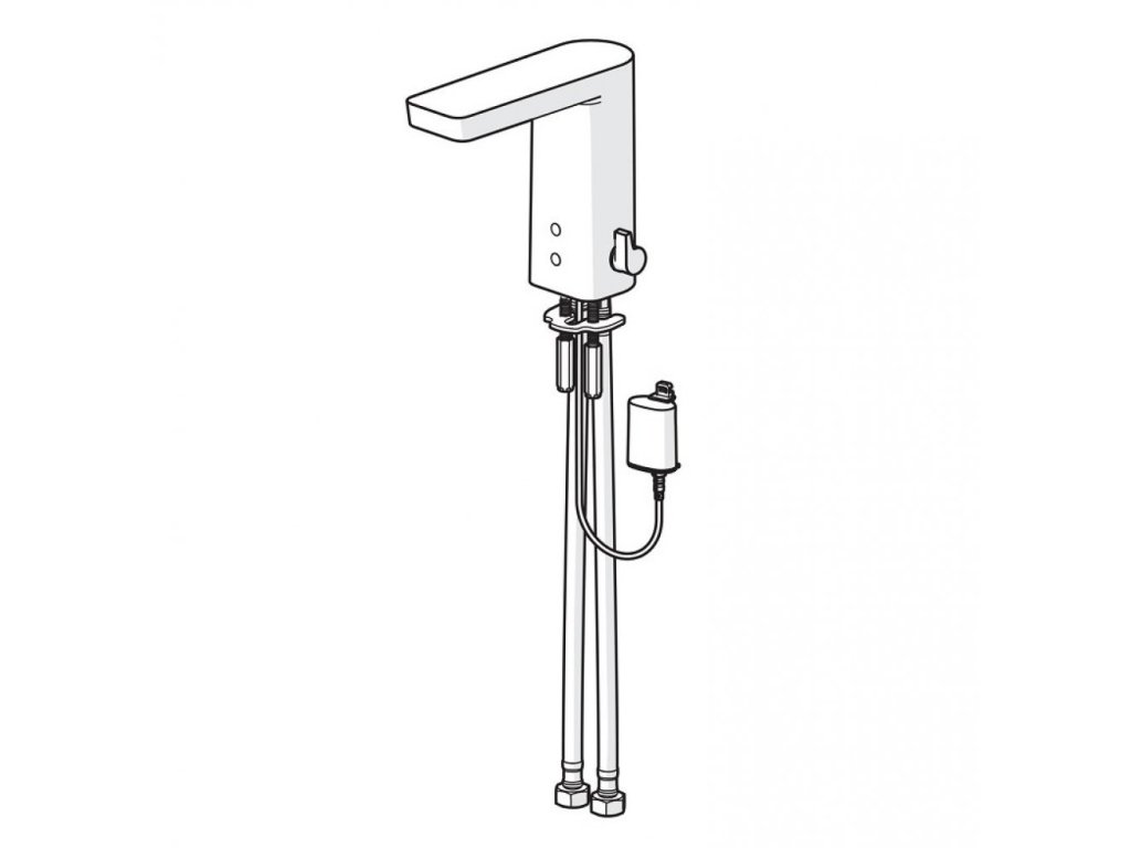 HANSASTELA - umývadlová senzorová batéria na studenú alebo predzmiešanú vodu. Batéria má pevné liate výtokové ramienko a rukoväť regulátora teploty vody.