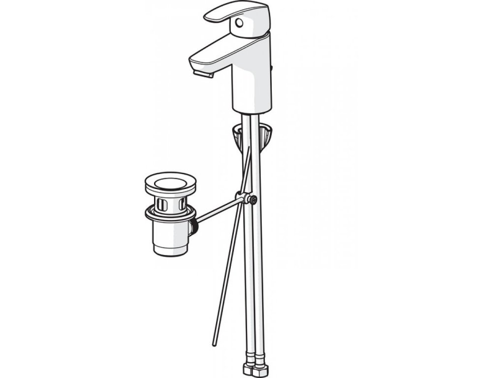 HANSAPINTO - umývadlová stojanková vodovodná batéria s odtokovou garnitúrou s tiahlom. Batéria je ovládaná pomocou páky so symbolom teplej a studenej vody, má pevné výtokové rameno.