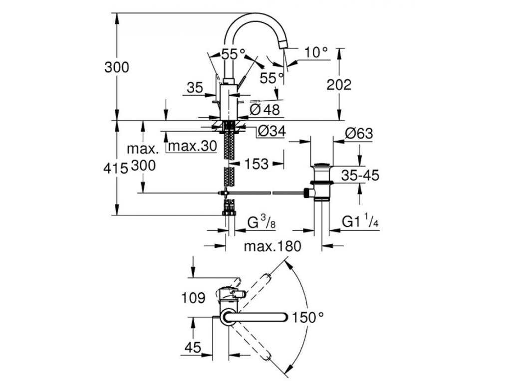 Páková umývadlová stojanková vodovodná batéria veľkosti "L" s odtokovou garnitúrou (DN 32). Otočná výtoková trubica s dorazom. S perlátorom. Skryté upevnenie kovovej páky.