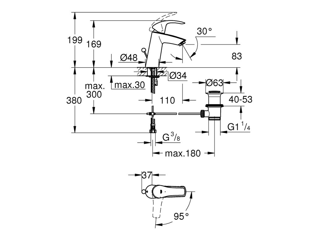 Páková umývadlová stojanková vodovodná batéria EUROSMART značky Grohe veľkosti "M", s odtokovou garnitúrou DN32.