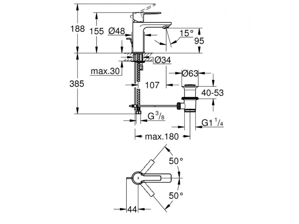 Páková umývadlová stojanková vodovodná batéria Lineare, s odtokovou garnitúrou DN32, veľkosť batérie XS.