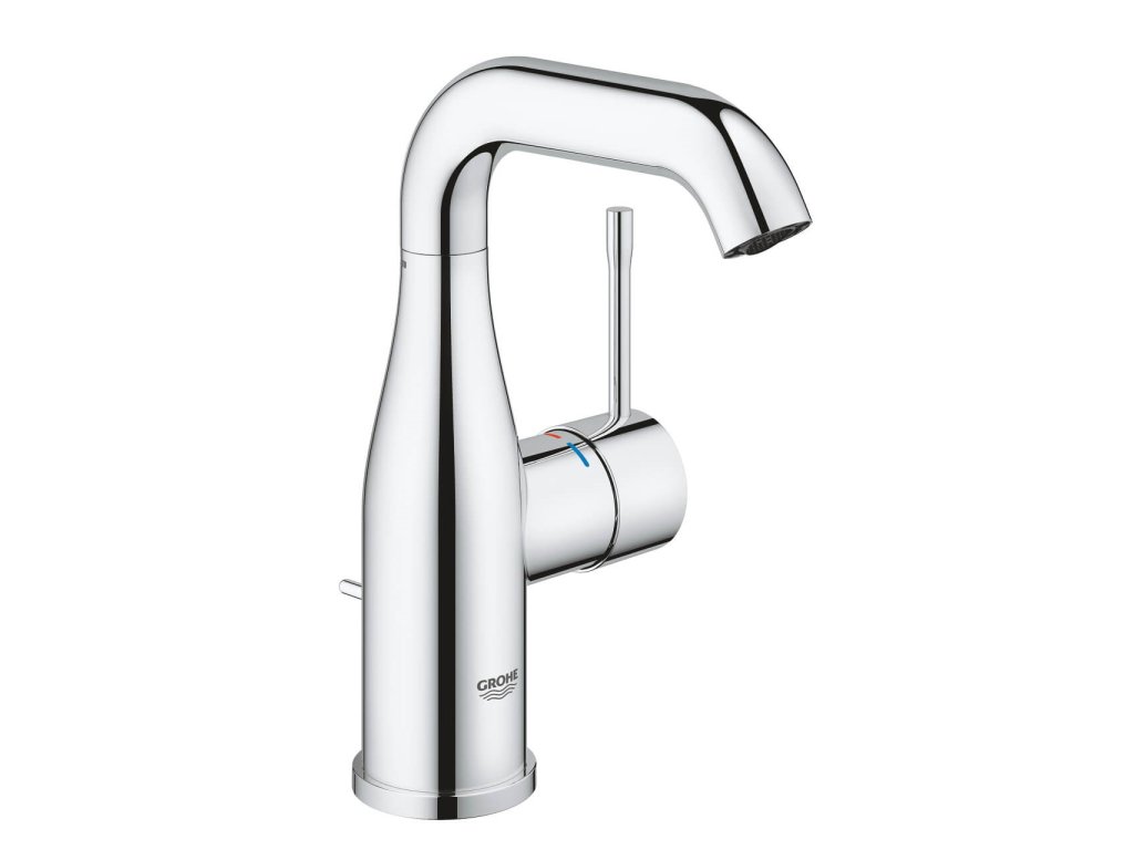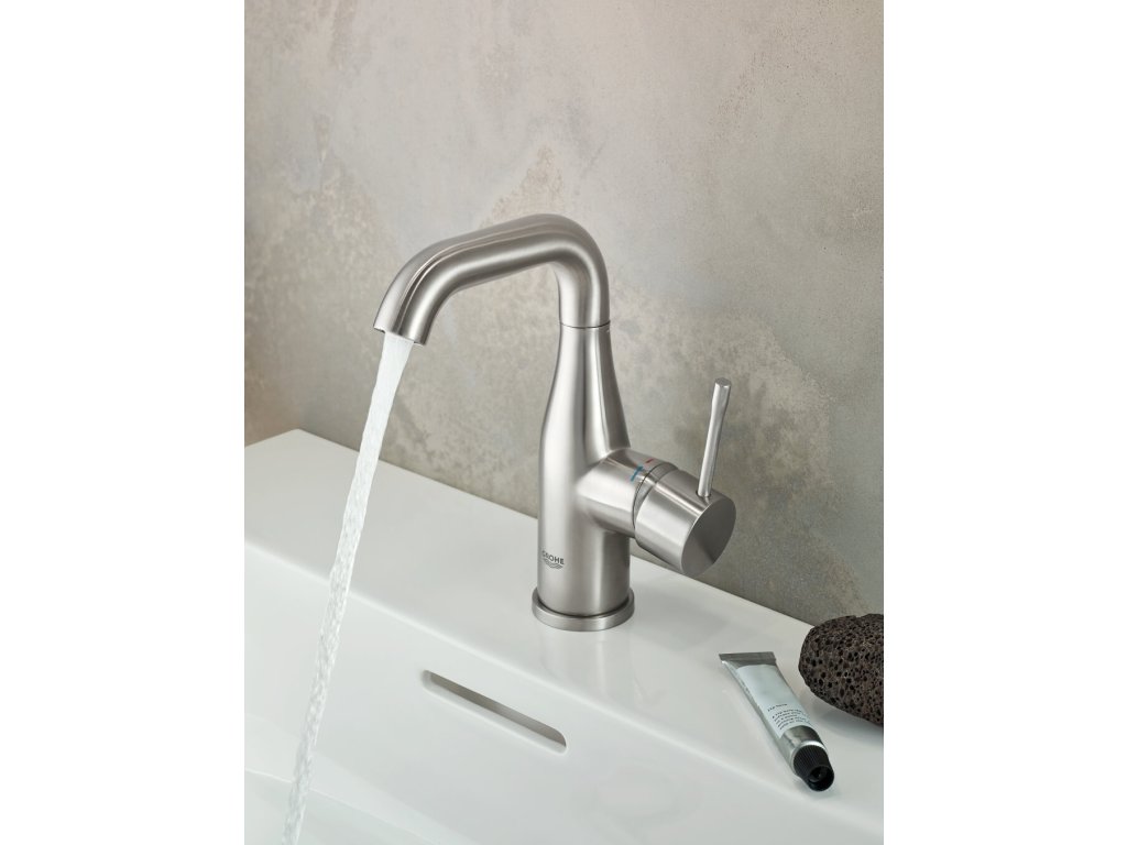 Moderná umývadlová stojanková vodovodná batéria ESSENCE značky Grohe, vo veľkosti "M", s kovovou pákou a s otočnou výtokovou trubicou s perlátorom, s dorazom.