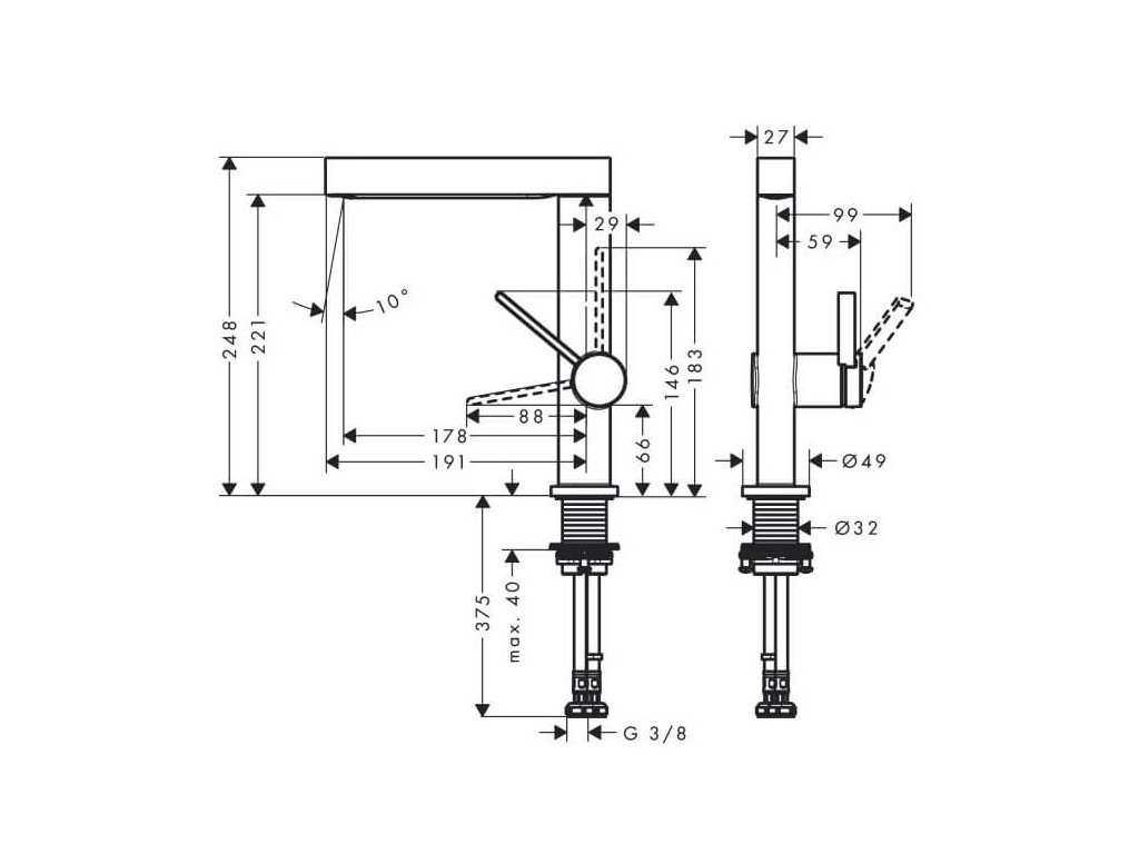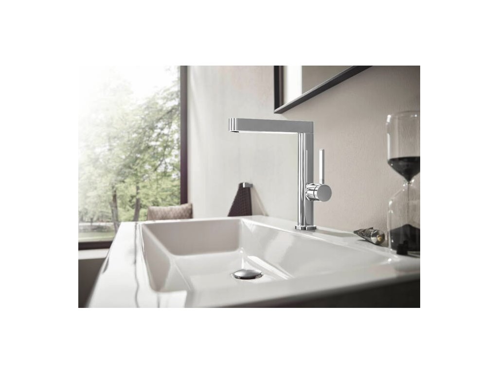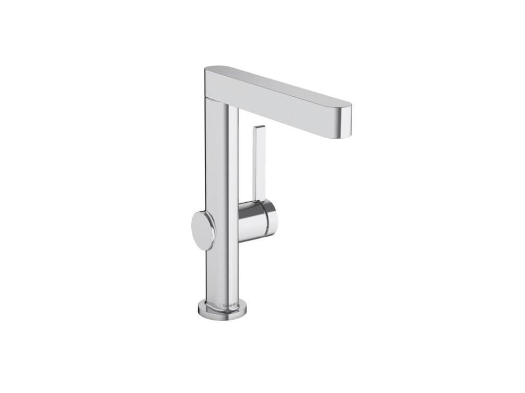 Umývadlová stojanková vodovodná batéria FINORIS značky Hansgrohe, dodávaná s kovovou odtokovou súpravou Push-Open G 11. Ramienko je otočné s rozsahom otáčania 120°.
