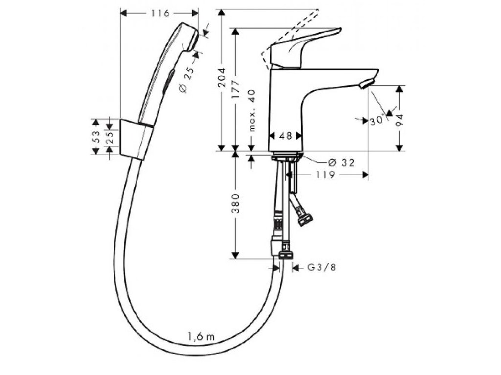 Páková umývadlová vodovodná batéria s odtokovou súpravou typu Push-Open. Súčasťou je i ručná sprcha Bidette so sprchovým prúdom a sprchová hadica dĺžky 1600mm.