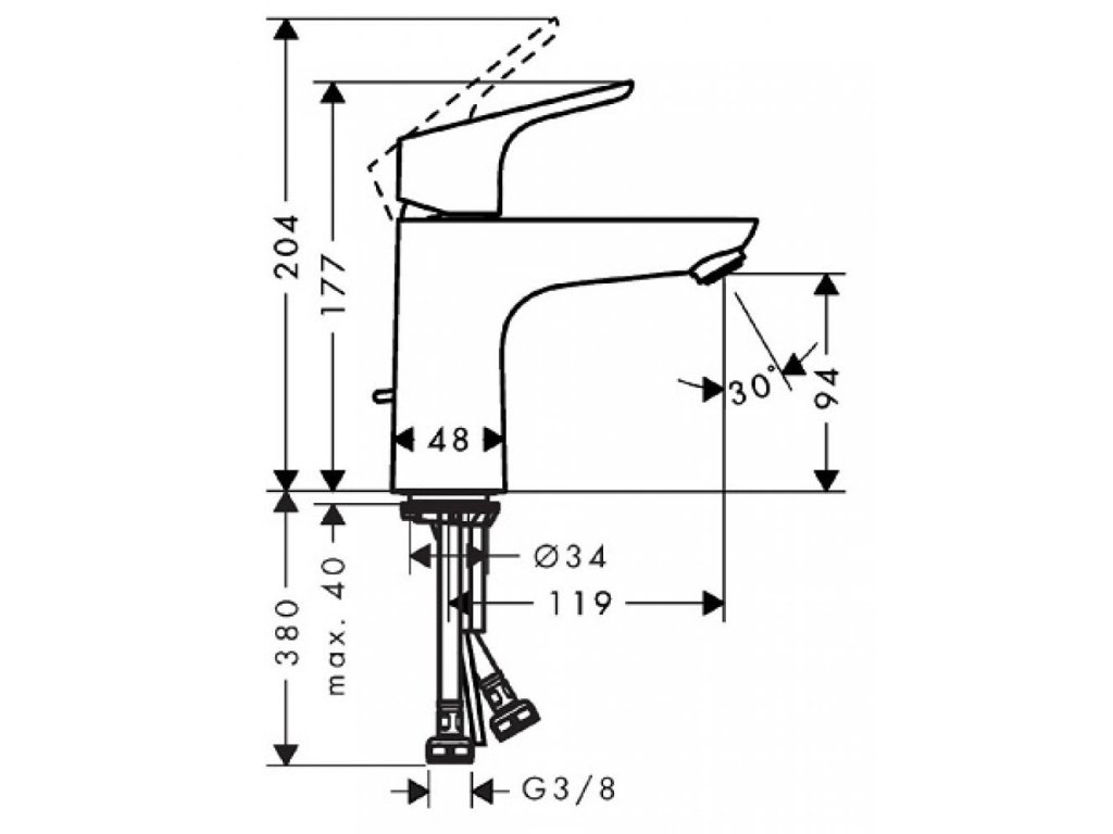 Páková umývadlová stojanková vodovodná batéria s odtokovou súpravou s tiahlom.