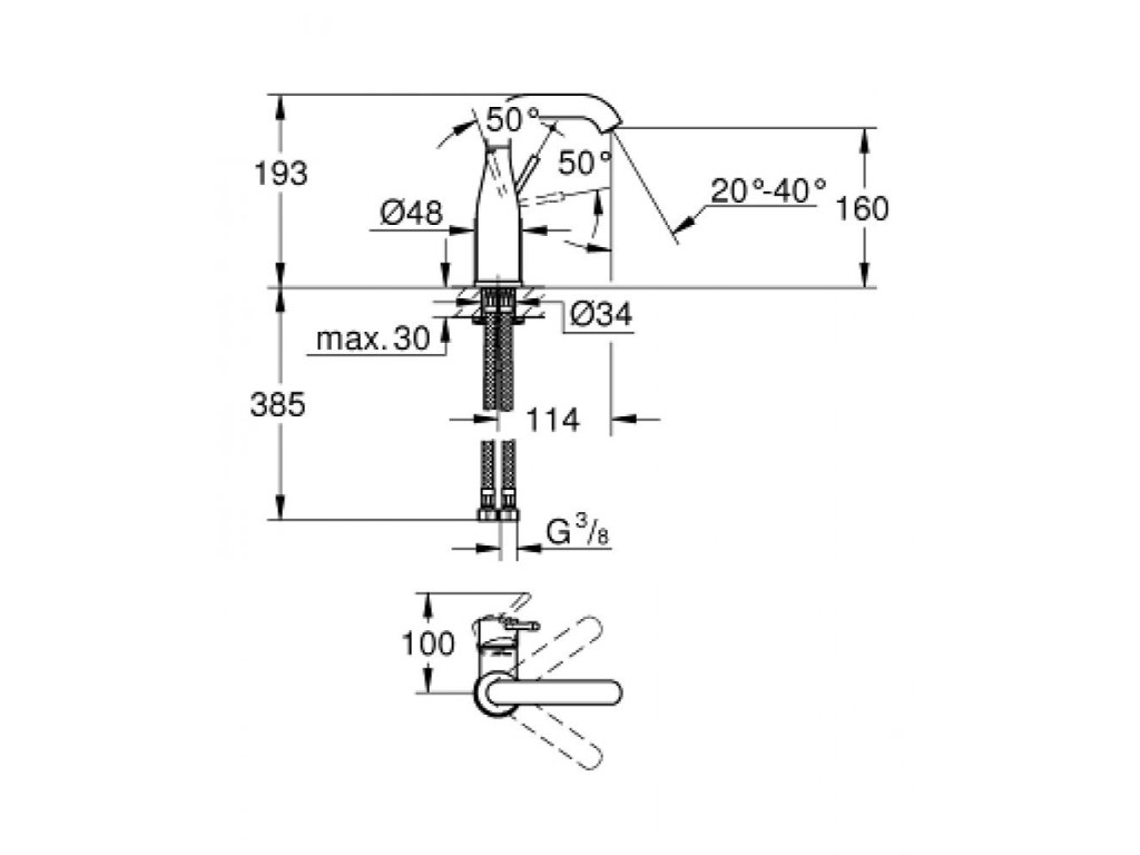 Otočné výtokové rameno s perlátorom a dorazom, s nastaviteľným rozsahom otáčania - 0°, 150°, 360°.