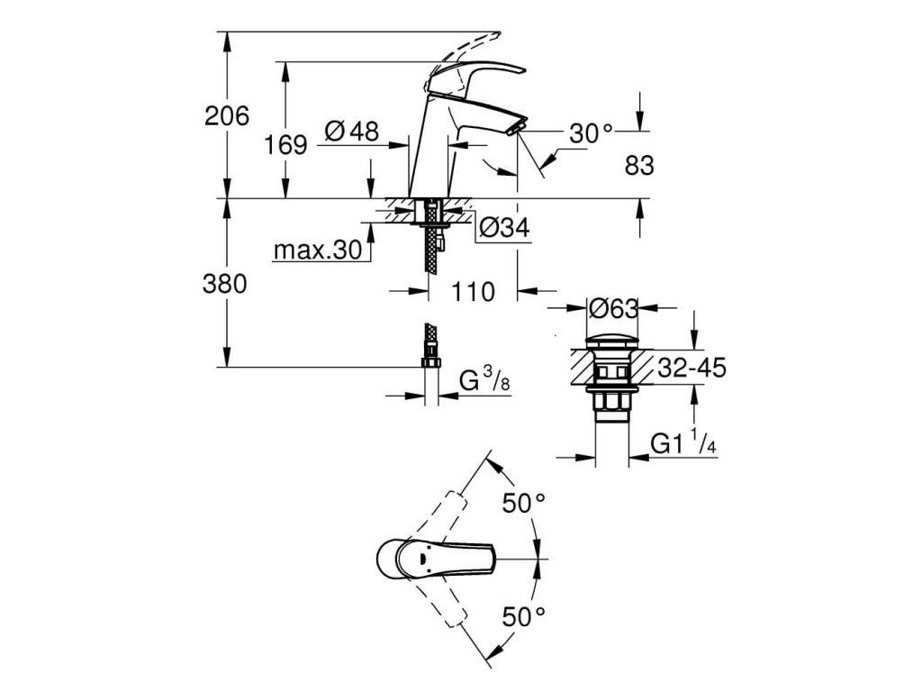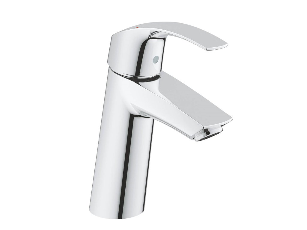 Umývadlová stojanková vodovodná batéria EUROSMART značky Grohe. Batéria je "M" veľkosti, jej súčasťou je aj odtoková súprava Push-Open.
