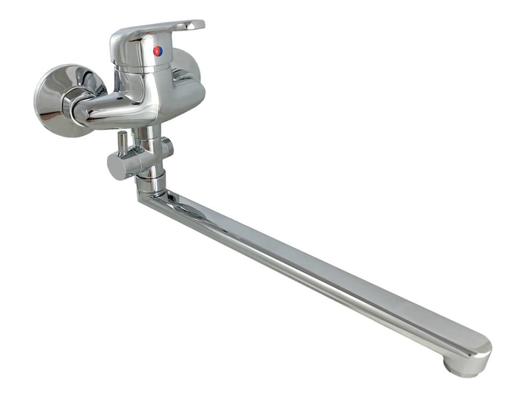 Páková vaňová stenová vodovodná batéria do bytového jadra s rovným liatym 30cm výtokovým ramenom, bez príslušenstva. Má keramický prepínač.