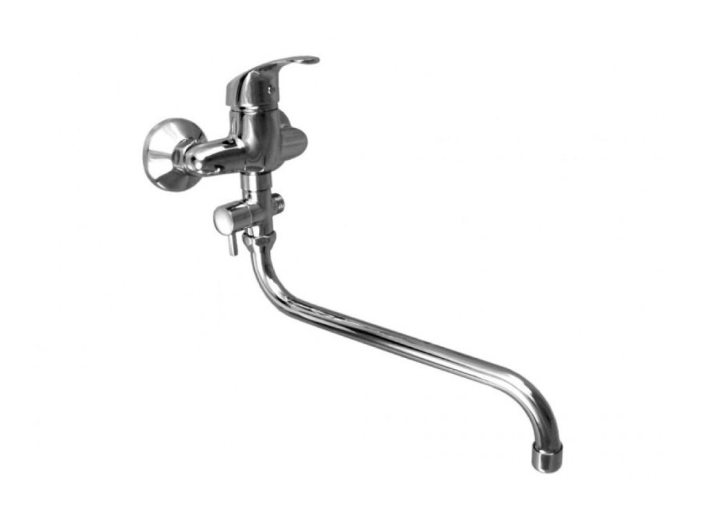 Páková vaňová stenová vodovodná batéria do bytového jadra s trúbkovým výtokovým ramenom dĺžky 30cm, s integrovaným keramickým prepínačom. Bez príslušenstva.