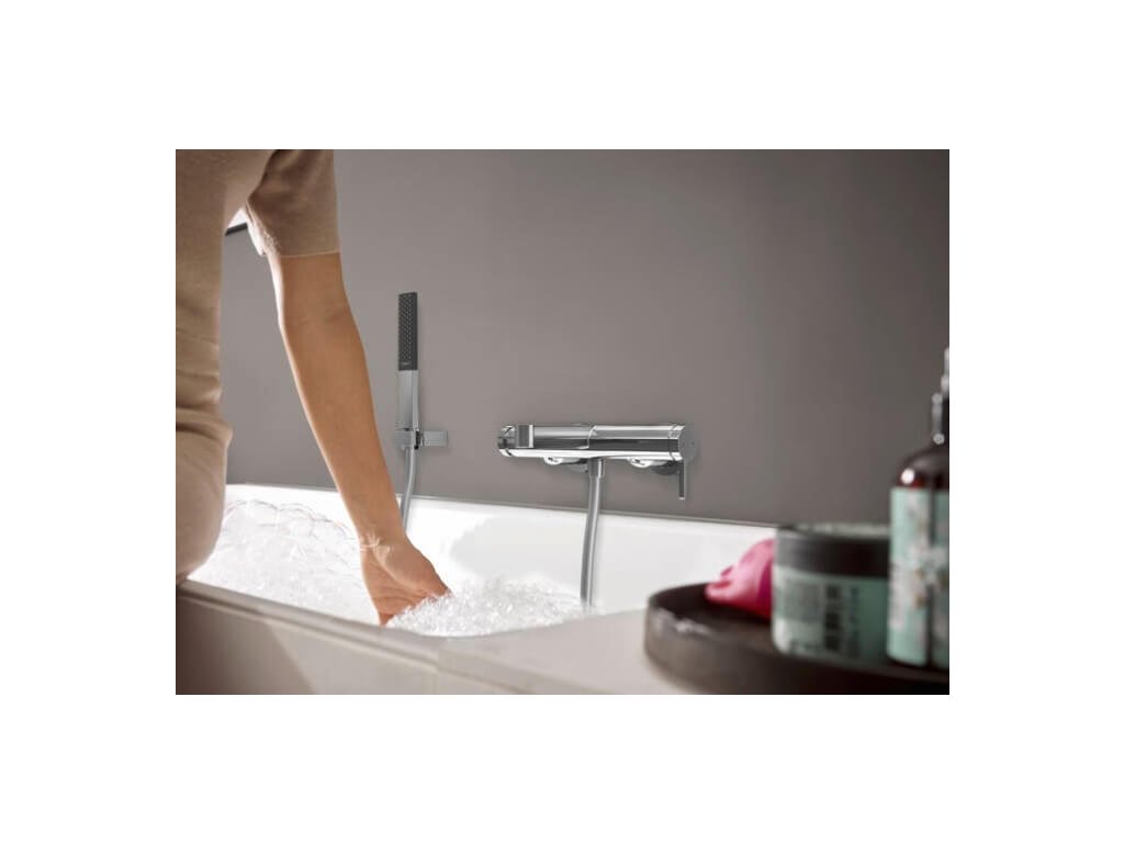 Vaňová stenová vodovodná batéria FINORIS značky Hansgrohe, s prepínačom tlaku Select s automatickým resetovaním. Batéria je dodávaná bez sprchového príslušenstva.
