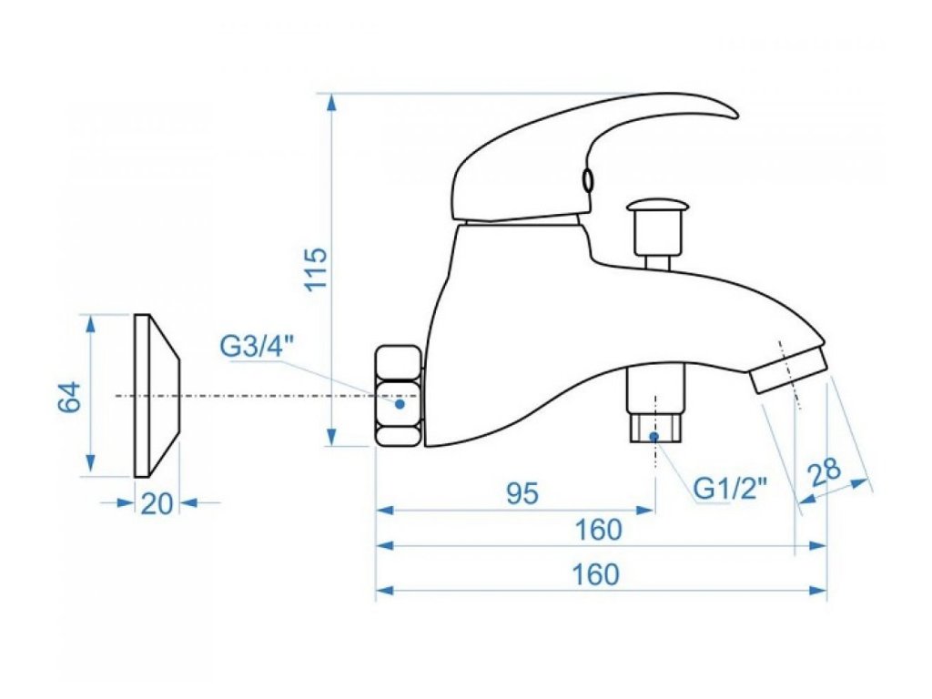 Páková vaňová stenová vodovodná batéria bez príslušenstva. Súčasťou balenia sú etážky aj krycie ružice. Prepínač režimu vaňa/sprcha je aretovateľný.Rozstup batérie je 150mm.