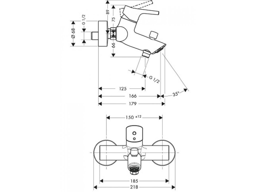 Páková vaňová vodovodná batéria, určená k nástennej montáži. Dodávaná bez sprchového príslušenstva.
