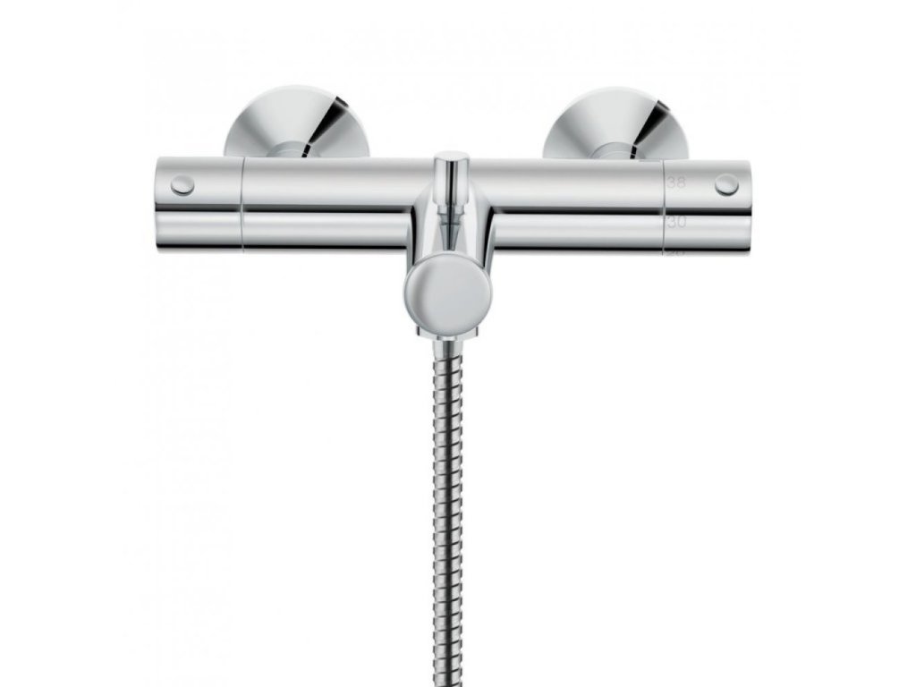Páková vaňová stenová termostatická vodovodná batéria bez príslušenstva. Súčasťou balenia sú etážky aj krycie ružice.