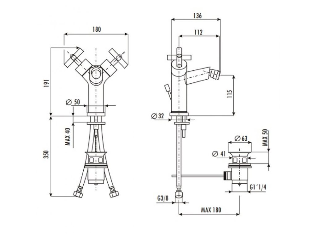 Bidetová stojanková vodovodná batéria JANUS, s odtokovou garnitúrou.
