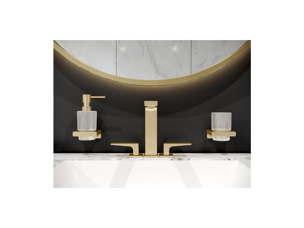 Dávkovač mydla na stenu AddSTORIS s držiakom, leštený zlatý kov-sklo