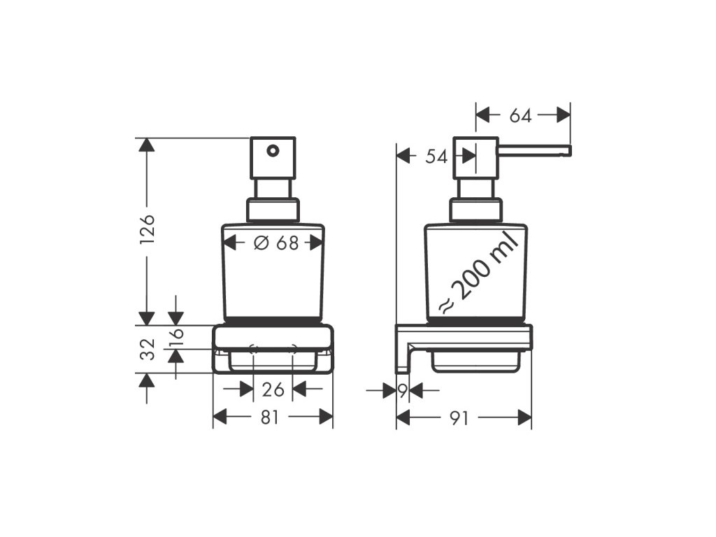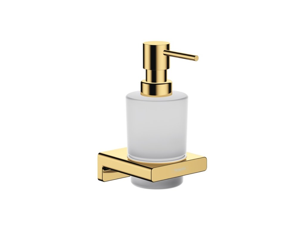 Dávkovač mydla značky Hansgrohe. Súčasťou je nástenný držiak AddStoris.