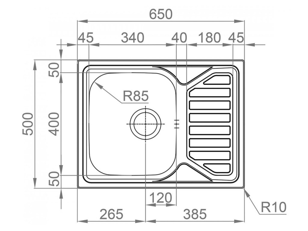 Vonkajšie rozmery drezu: 650 x 500 mm.