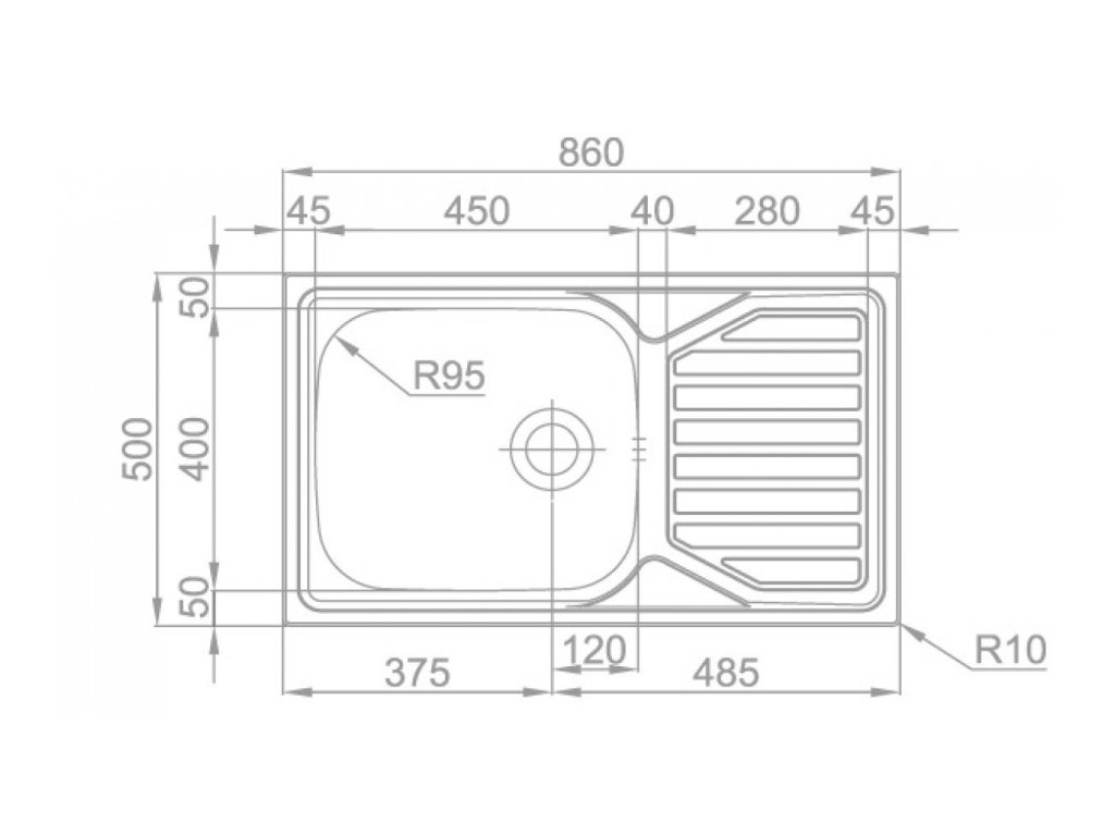 Vonkajšie rozmery drezu: 860 x 500 mm.