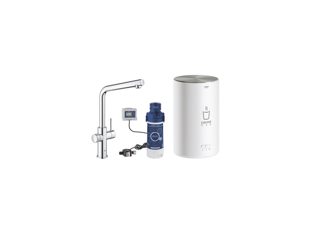 Drezová vodovodná batéria DUO RED značky GROHE, s ohrevom vody a s filtráciou, so zásobníkom M, pre okamžitý ohrev vriacej vody.