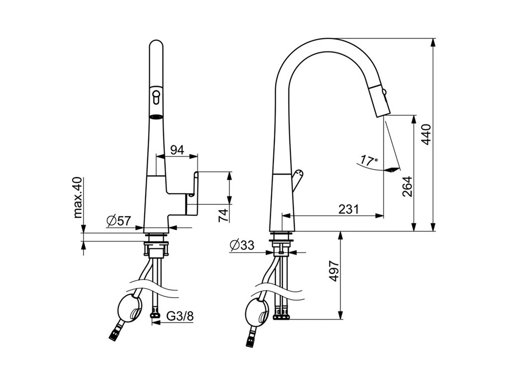 Pripojenie pomocou tlakových hadíc G 3/8.