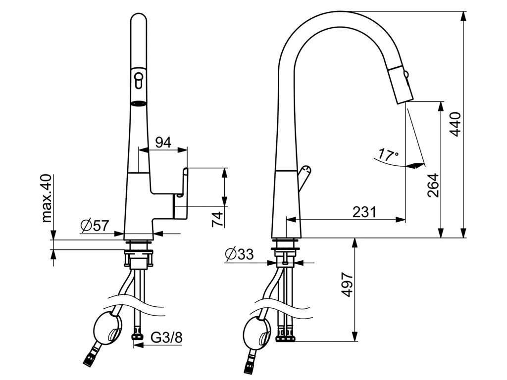 Pripojenie pomocou tlakových hadíc G 3/8.