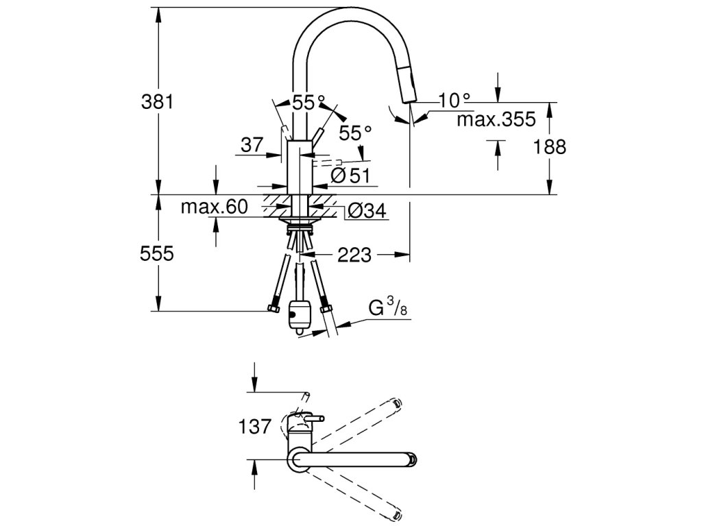 Páková drezová stojanková vodovodná batéria CONCETTO značky Grohe s vyšším výtokovým ramienkom tvaru "U". Ramienko je otočné s otočným uhlom 360°. Batéria má praktickú duálnu vyťahovaciu sprchu s perlátorom, s možnosťou prepnutia medzi perlátorom a SpeedClean sprchovým prúdom. Vďaka systému GROHE EasyDock sa sprchová hlavica plynule sama zatiahne späť do výpustu.